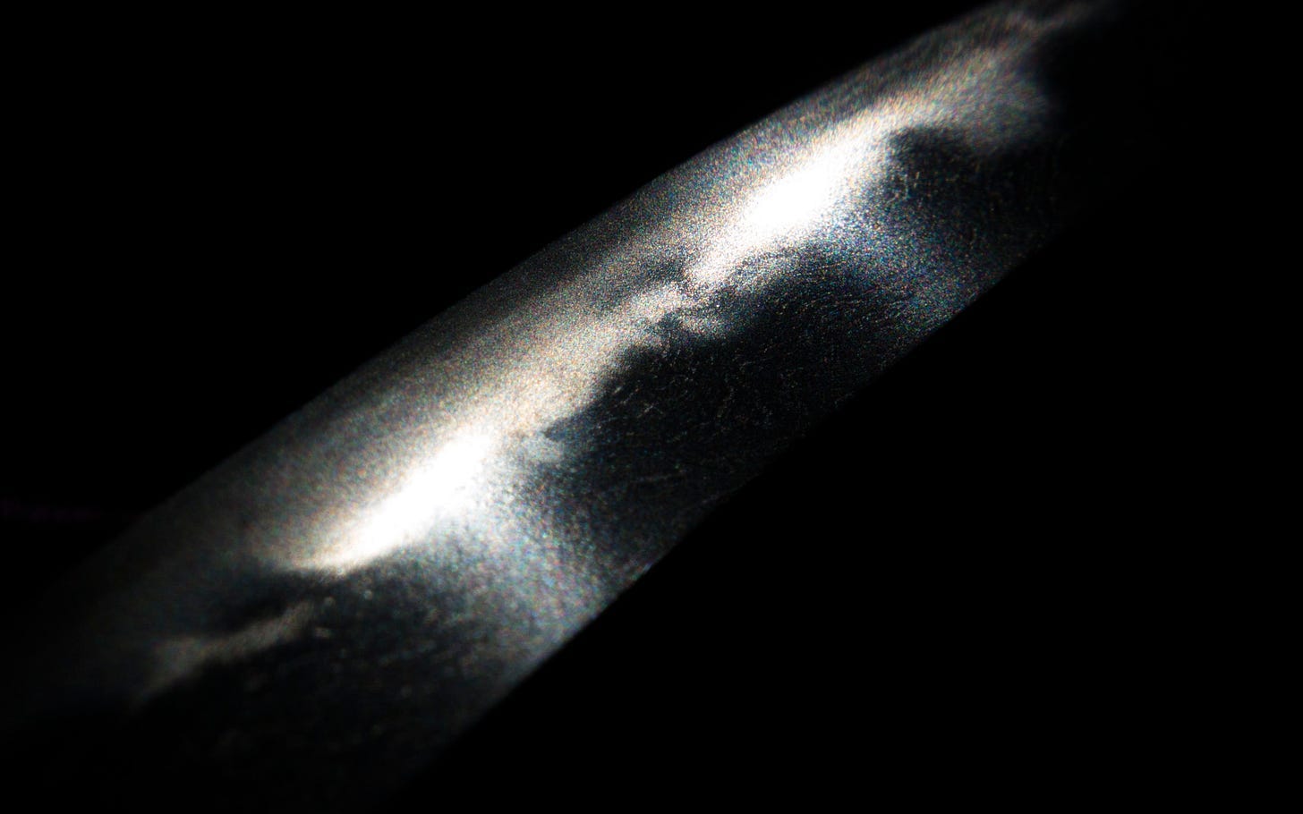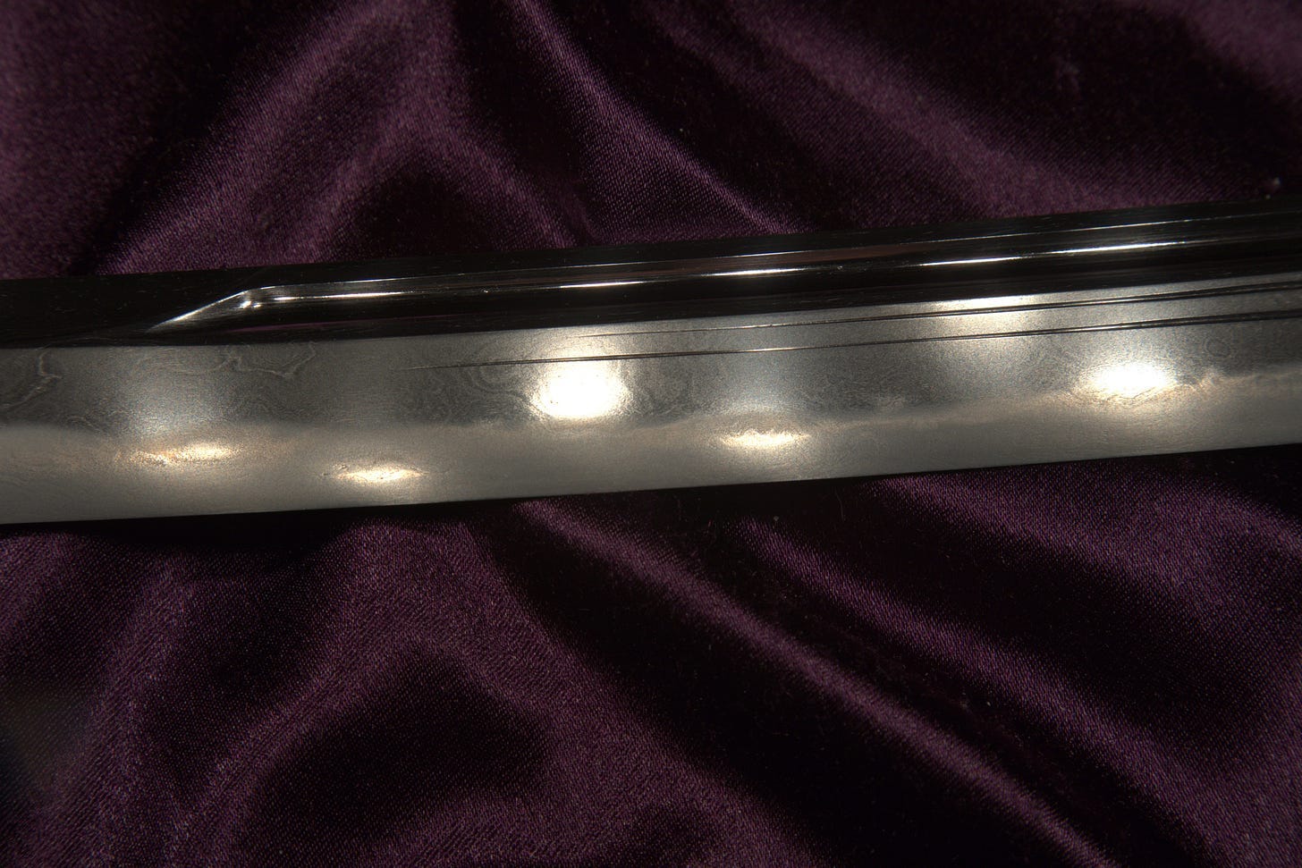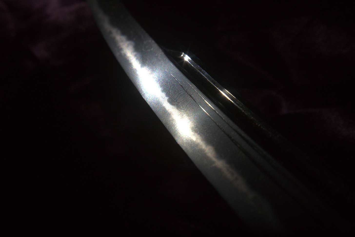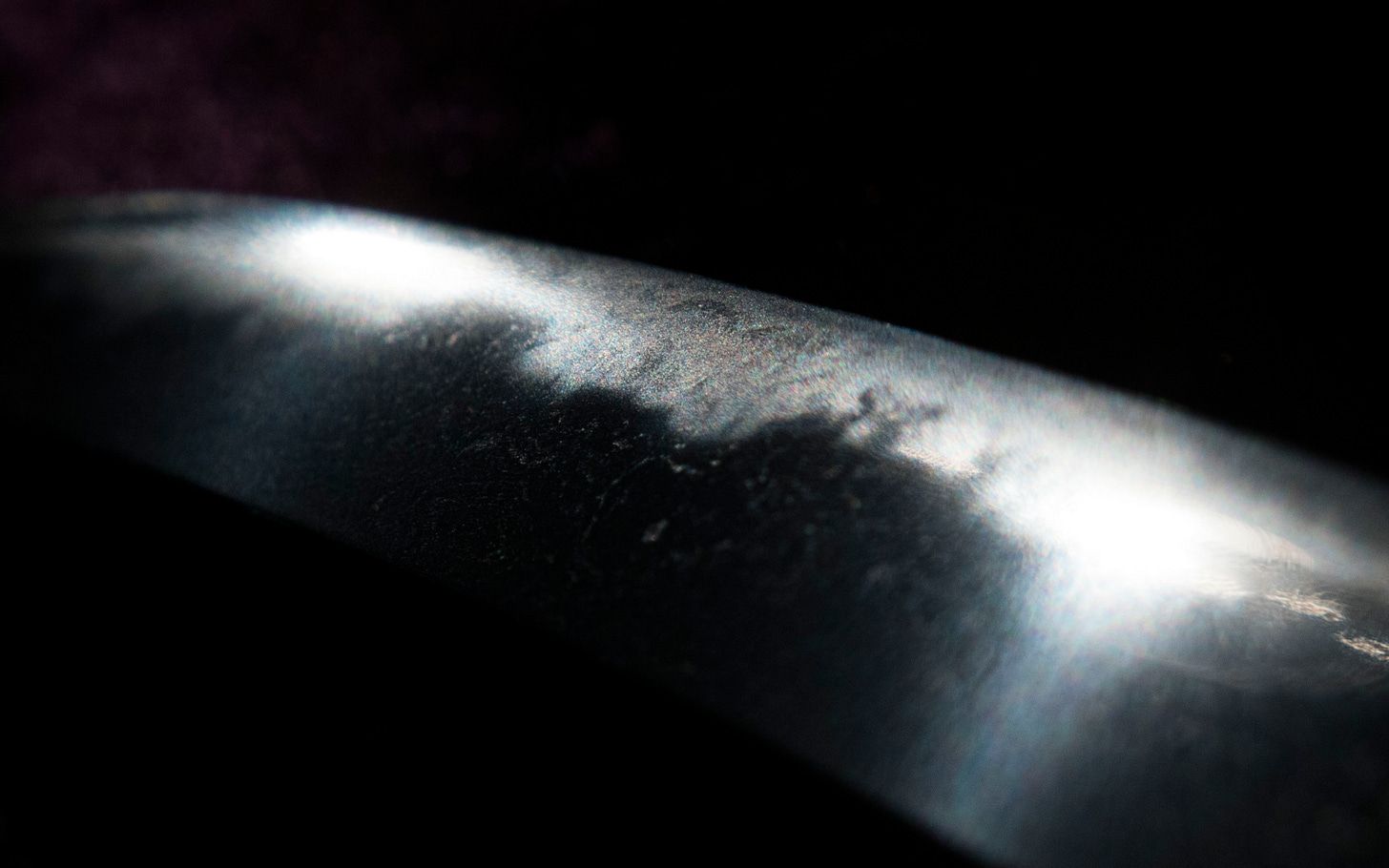 At the monouchi, the edge takes on a frosty quality from the abundant layers of nie. This frosted appearance is a hallmark Soshu-den excellence.