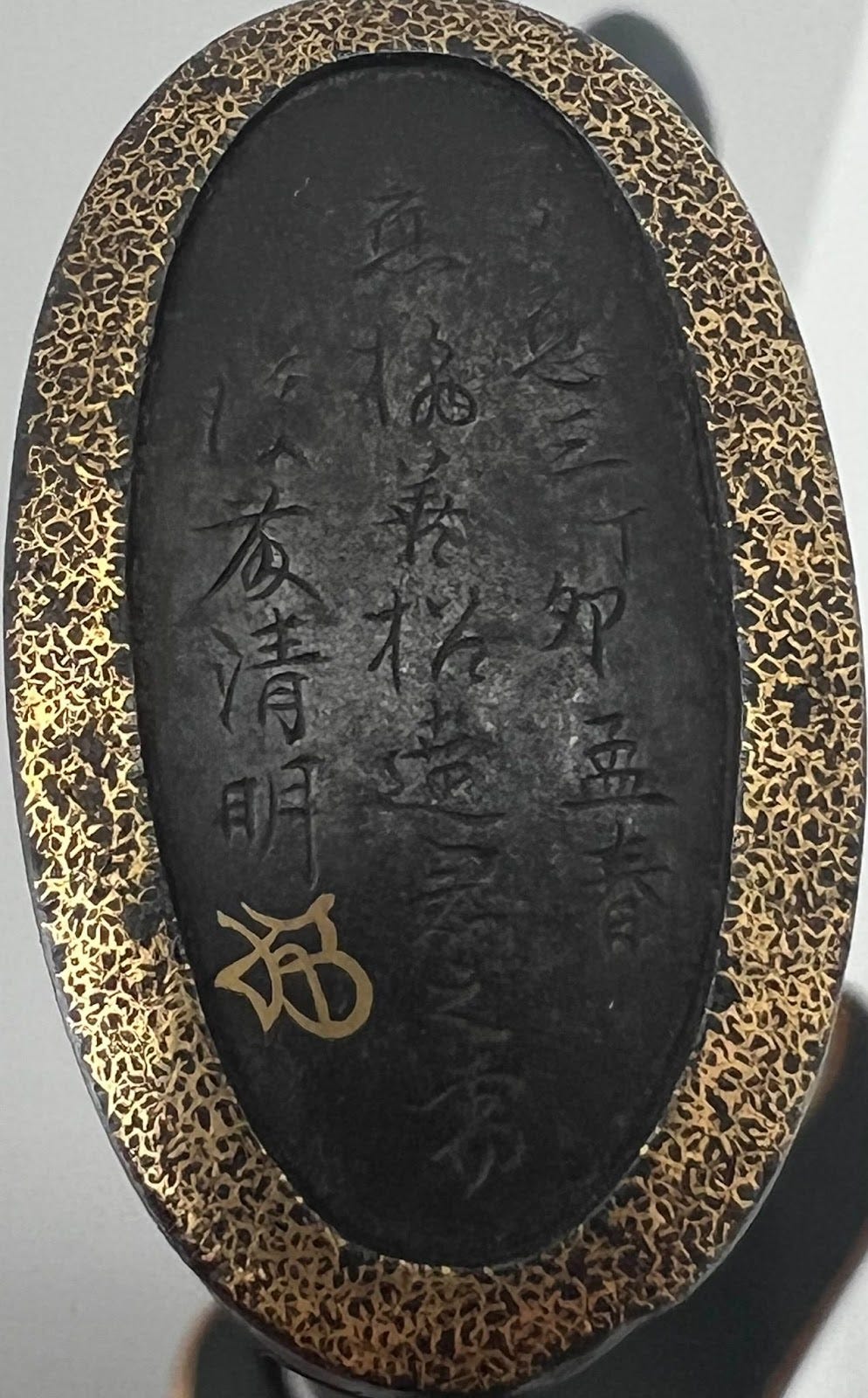 The name of the client, however, leaves some room for speculation. The name is composed of four characters, which is the most common variant, that is, two characters for the family name, and two characters for the legal first name. However, it appears that the name in question is comprised of one character for the family (or clan) name, Tachibana, two for the first name, Yoshimatsu, and one for the legal first name, Satoshi, with the character for the latter leaving several more reading options. An online search of numerous combinations and omissions of the characters for said name have not yielded any results. As the fittings were made four years after Kiyokawa’s death, the koshirae was commissioned by the person who held Kiyokawa’s sword in his possession following his assassination, possibly one of his associates or relatives. Apart from ongoing research on the craftsman Isaburō and the person who commissioned the fittings, and likely the entire koshirae, another extremely rare aspect of this mounting is the fact that it was designed to be worn on the right side of the wearer. That is, the kurigata, to which the sageo cord is tied, is positioned on the opposite side than usual, and the hilt wrapping and position of the menuki follow the approach used for a sword worn on the right side. Thus, it must be assumed that the wearer was either left handed, or was faced with an incapacity that made it impossible to use or draw the sword with his right hand from the standard left position in the sash.