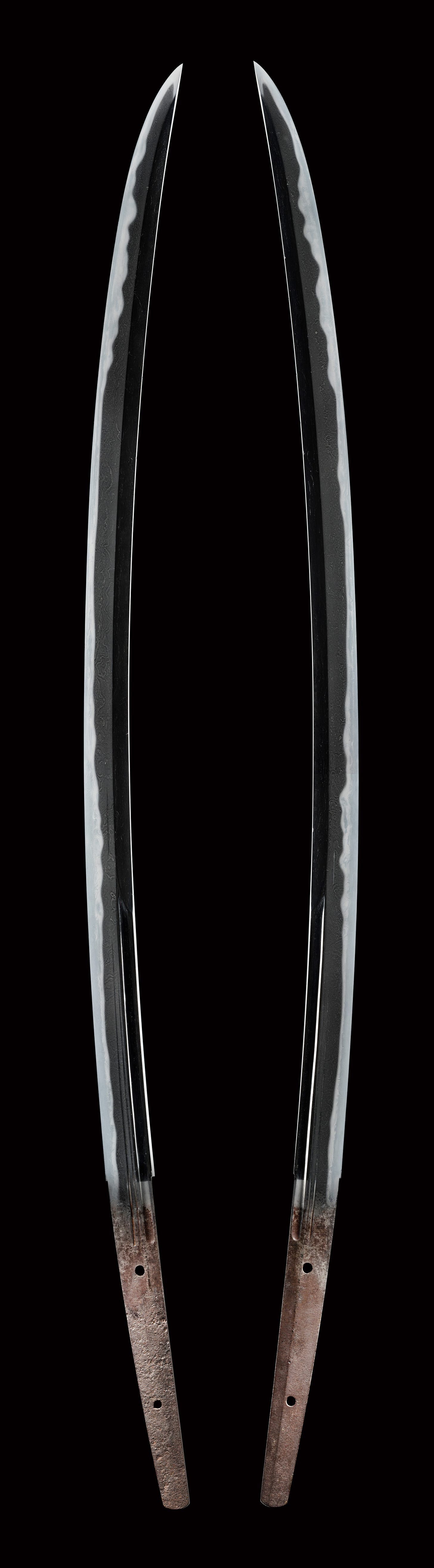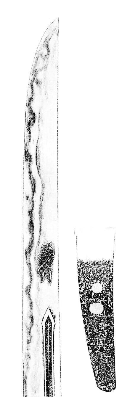 Nakago: ō-suriage, kurijiri, kiri-yasurime, two mekugi-ana, mumei