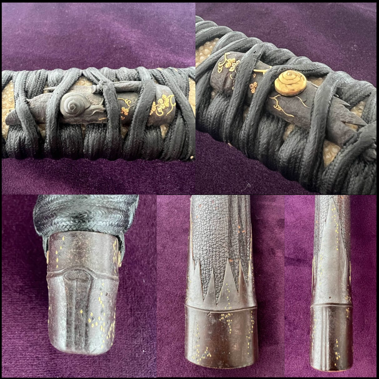 The mounting of the Ochiba is every bit as fascinating as the Ochiba blade. First, its scabbard (saya) is covered in wrinkled leather (shibogawa), which was patterned to resemble bamboo, an interpretation that is extremely rarely seen. Also rare is the fact that the craftsman left his name fairly prominently embossed at the top of the scabbard: Isaburō Motoie (伊三郎基家). Unfortunately, the maker and his school or workshop could not yet be identified, although this is often the case with scabbard makers and lacquer artists, etc., as only few records of their names and lineages were compiled. The iron fittings, delicately highlighted with gold, follow the tree theme of the scabbard, with the hilt ornaments (menuki) depicting snails on pieces of old wood with some tendrils, and the tsuba depicting an oak tree.