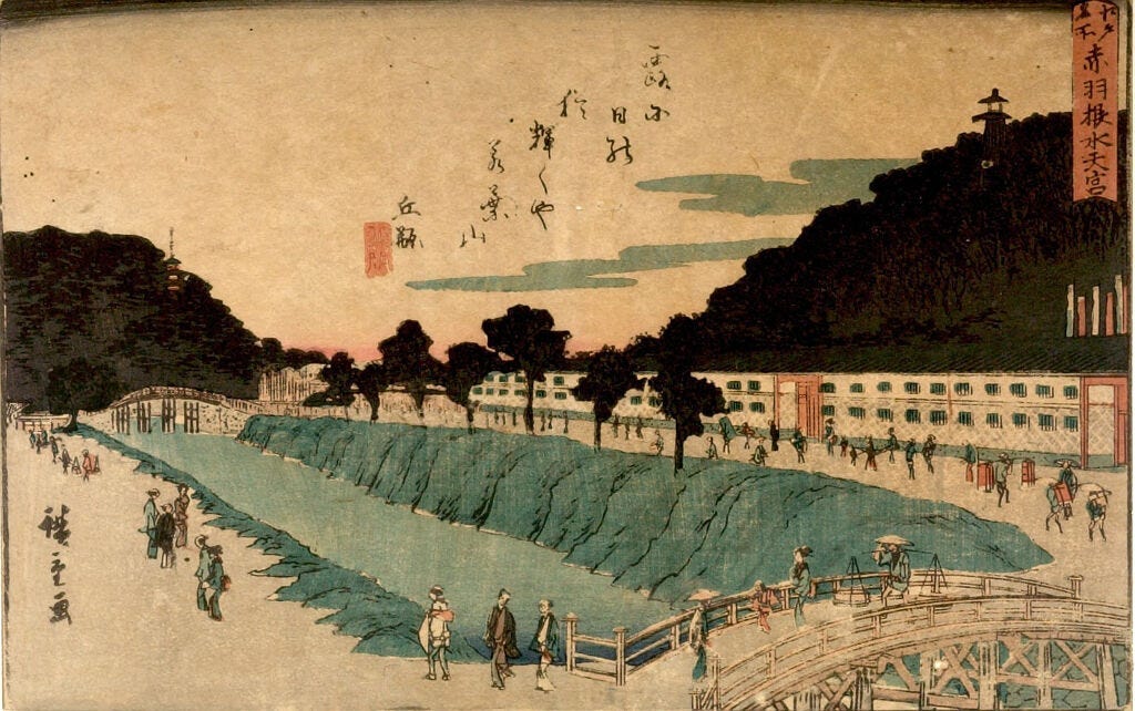 Akabane Bridge and Suiten Shrine (Akabane Suitengū), from the series Famous Places in Edo (Edo meisho)